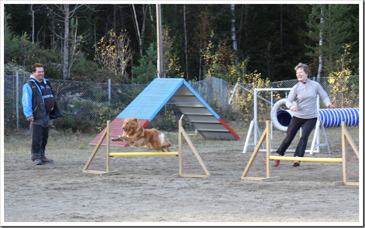 Det var så morsomt å se på de andre hvor mye de lærte i løpet av disse to dagene. Rottweileren Luna som var redd for høyder og ville slettes ikke opp på noe bord. Plutselig så løsna det og bordet var da ingen kunst! St. Bernhardshunden Ceesha som formelig koste seg gjennom banen. Altfor stor til å gå gjennom slalomen, men fikk det så fint til etter hvert og fantes ikke redd for å gå på møne og bom. 9.mnd gamle Border Collien Dennis som var akkurat som BC flest, fullstendig gira på tunnell og hadde såååå lyst til å hoppe og sprette akkurat som den fant det for godt. Se hvordan den raskt lærte seg at det ikke var han, men føreren som bestemte når og hvilke hindre den skulle ta.