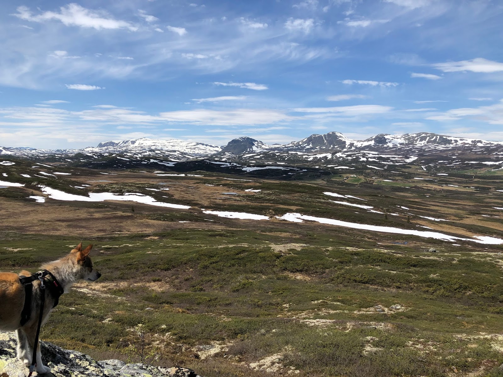 I denne varmen er det bare å stikke til fjells, i hvert fall for oss med bikkjer som nekter å bade. Der er det kjøligere, det er stort sett alltid vind og det er litt snø. I fjellet er det fortsatt mye snø, men i mellomhøyden så er det mange turmuligheter uten for mye snø.