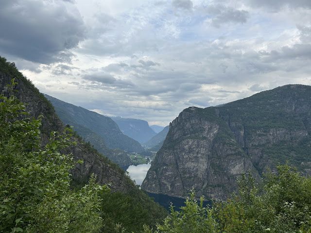 Denne gangen kjørte vi Hol-Aurland for å komme over til sogn og da er det obligatorisk med et foto-stop her med utsikt over Vassbygdvatnet. Mens jeg begynte å lure på hvor i all verden gikk de da de bufarte fra Låvi til Grimsete. Vi tok en snartur nedom Vangen også, men vi var begge enige om at der var alt bedre før. Vi likte bedre 1982-utgaven enn 2025-utgaven.