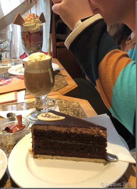Et av hovedmålene for dagen var at vi skulle spise kake! Og heldigvis så viste det seg at konditoriet vi hadde passert noen ganger allerede hadde oppe langt utover dagen. Og veldig mange gode kaker å velge mellom…. Turen i Ludvigstrasse ble som nevnt tidligere noe kortere enn beregnet og regnværet gjorde sitt til at det var godt å komme inn.