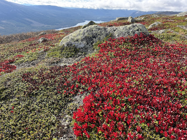 Her oppe var det mye rypebær som lyste opp og det kunne se ut som det hadde vært enda mer, at noe av det hadde frosset og var blitt brunt. Men dette var absolutt en "højdare", sånn fargemessig.